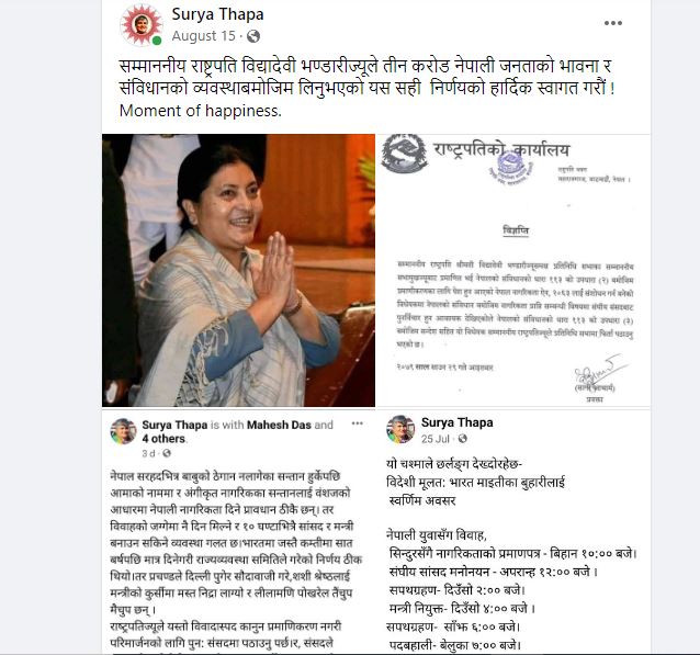 Surya Thapa, a Politburo member of the UML, on July 25, 2022, claimed a foreign woman who marries a Nepali man can obtain Nepali citizenship on the day of her wedding, and can even be appointed minister on the same day.