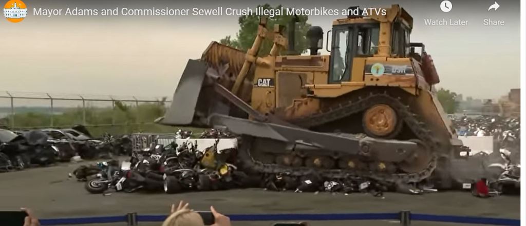 We started by googling ‘Dozer crushes motorbikes.’ On its website, the Indian broadcaster NDTV had published news about the event. According to the report, the New York Police Department in June this year destroyed about 100 seized dirt bikes, all terrain vehicles and other illegal motorcycles deploying a bulldozer.
