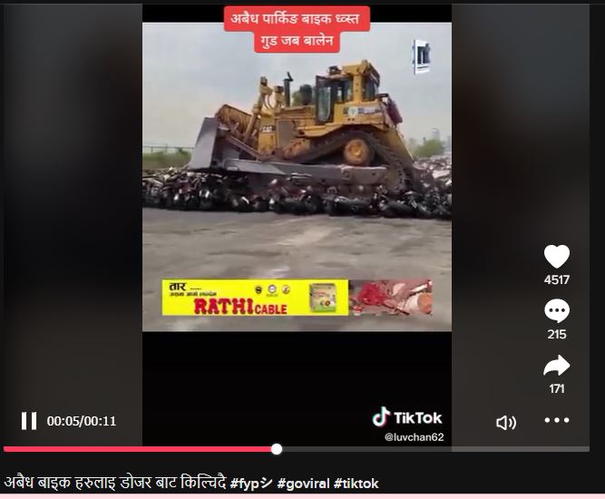 A TikTok user, ‘Luv Chan 62’, shared a video claiming that Shah sent a bulldozer to crush illegally parked motorcycles in the city. On August 30, 2022, the TikTok user posted the video with a caption in Nepali: “Illegally parked bikes destroyed. Good job, Balen.” A bulldozer can be seen crushing motorcycles parked next to a road in the 11-second video, which has received 229 comments, 4,496 likes, and 171 shares.