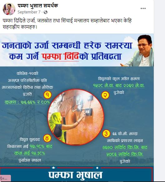 On September 7, 2022, Pampha Bhusal’s supporter page shared infographics with a caption: “Some commendable works done by Pampha sister after she took charge of the Ministry of Energy, Water Supply and Irrigation.” The next day, another Facebook page shared the content.