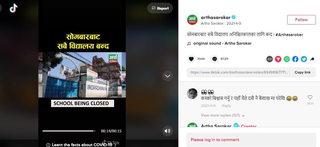 Both TikTok posts have one thing in common: They both used audio from a report published by Artha Sarokar, a business news outlet, on April 9, 2021. “Schools across the country will close,” said the female news reader for the outlet. “Following an increase in Covid-19 infections, the Health Ministry has recommended that schools be closed.” According to a report published in The Kathmandu Post on April 10, 2021, the Health Ministry suggested the shutdown after cases of Covid-19 infection were recorded in Kathmandu Valley schools and at a Pokhara engineering college.