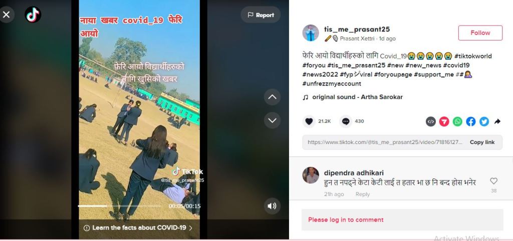 A TikTok account named @tis_me_prashant25, on December 27, posted a video clip with a text that read: “Here’s news: Covid-19 resurfaces [in Nepal]. Again, there’s good news for students.” The clip is accompanied by the following audio: “All schools will be closed beginning December 30.” The post has received 22000 reactions and has been viewed over 661000 times.