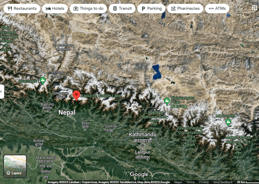 Nepal Check confirmed via Google Maps that the lake in the video is Kapuche Glacier Lake, which is located in the Annapurna region of Nepal’s Gandaki Province, about 280 kilometers west of Mount Everest.