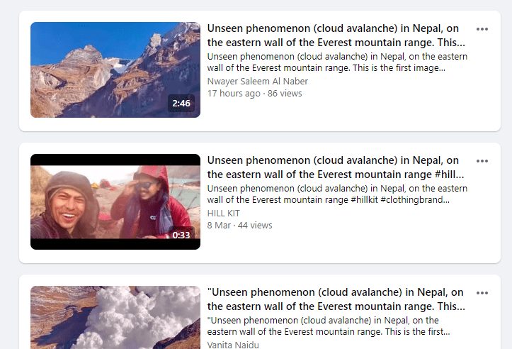 Alaa Elsayed had posted the video on Facebook two days earlier, on February 24, 2023, with the caption, “Unseen phenomenon (cloud avalanche) in Nepal, on the eastern wall of the Everest mountain range.” As of March 11, 2023, his post had received 2.9 million views, 88,000 likes, and over 2,200 comments. Several Facebook posts have claimed the video shows the eastern wall of the Everest mountain range.