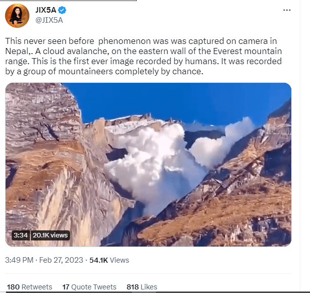 On March 1, 2023, @NDTV, the Twitter handle of New Delhi Television, posted a photo of the same “avalanche” which was attributed to Dr. Subramanian Narayanan on LinkedIn (see sreenshot). NDTV tweeted: “Video Shows ‘Unseen’ Phenomenon Of ‘Cloud Avalanche’ On Mount Everest In Nepal.”