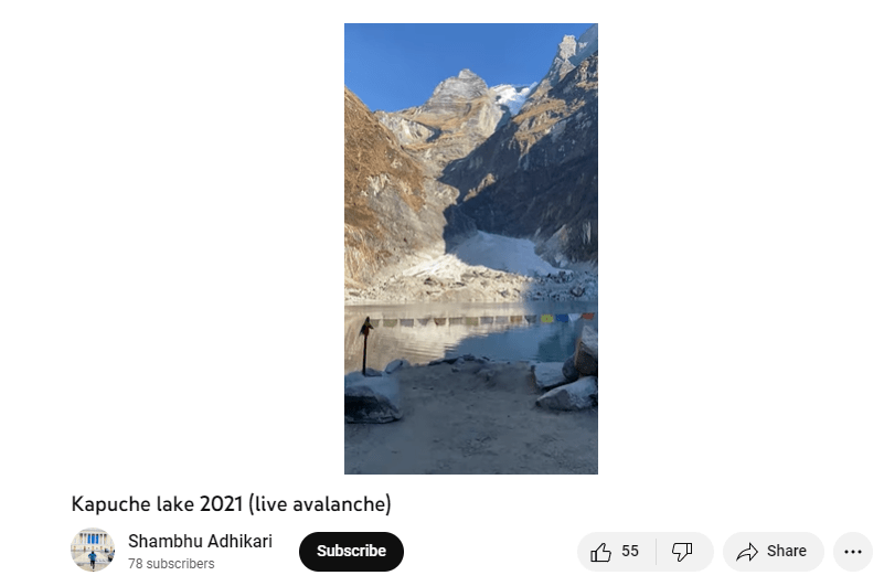 To learn more, we conducted a YouTube keyword search using terms like “Kiran Shrestha avalanche.” ShresthaKiranz uploaded a 4 minutes and 50 seconds video to YouTube on January 11, 2021. “Kapuche lake 2021 (avalanche)” is the video’s title.
