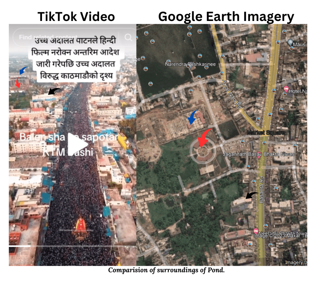 By comparing the TikTok video with the Grand Road section of Puri on Google Earth, it was evident that the landscape and surroundings matched. Consequently, it can be concluded that the video was geolocated to the Grand Road section of Puri.