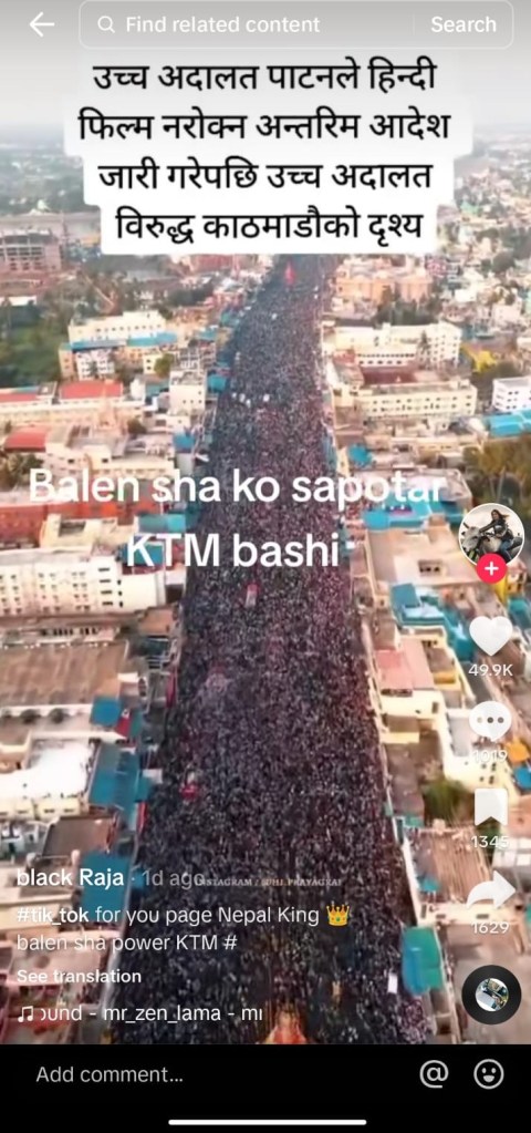 On June 22, the Patan High Court issued an interlocutory order against the mayor’s decision to ban Indian movies in cinemas in Kathmandu Metropolis. The post further claims that the crowd is made up of supporters of Balen. The video has garnered over half a million views on TikTok, The post has received over 50,000 likes, over 500 shares, and more than 950 comments as of June 27. The account has posted several videos using the word “Balen,” the stage name that Mayor Shah uses for his rap songs.