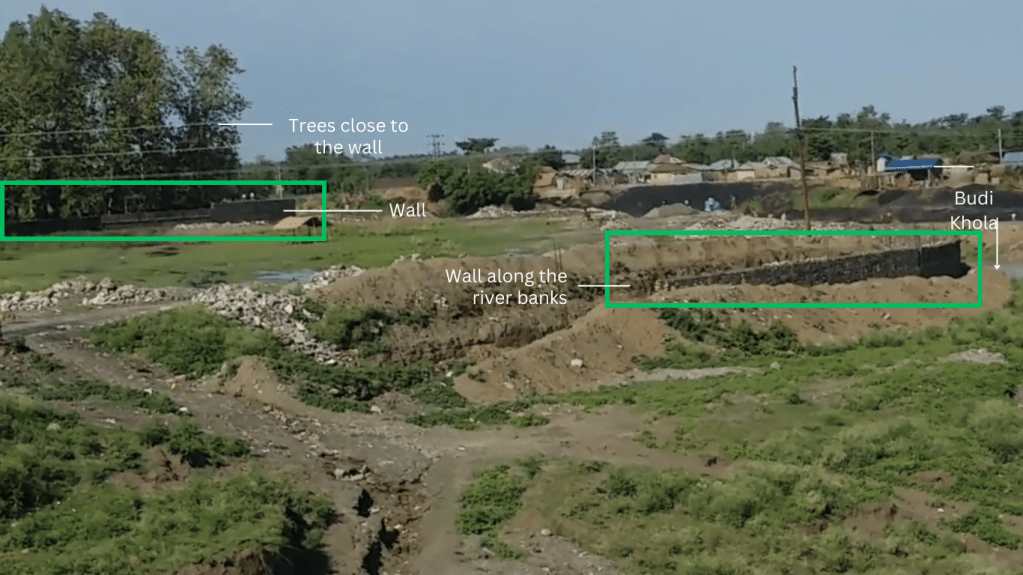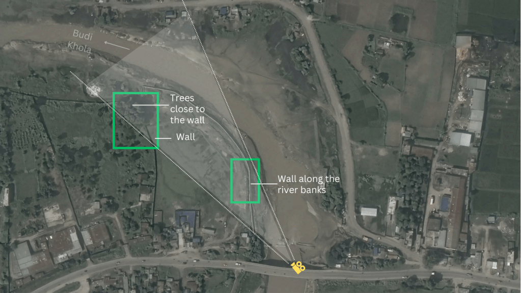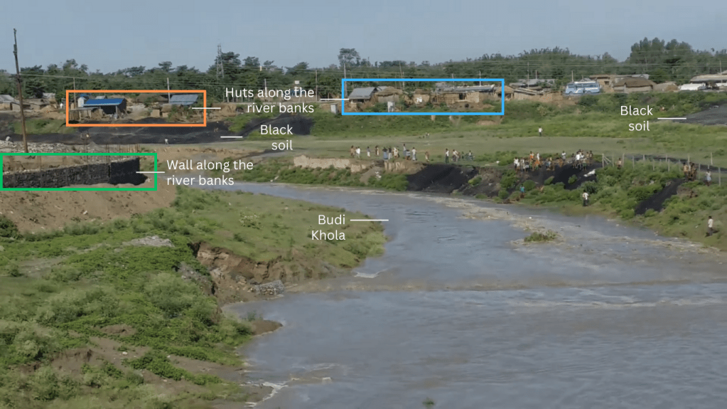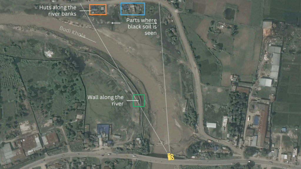 Despite insights from the video, pinpointing the river and settlement remained challenging. We utilized Google Earth to juxtapose imagery with the viral video’s scenes. Notably, black soil imagery on Google Earth corroborated the match, and a bridge was also identified. This evidence confirms the Budi Khola River’s flood, causing settlement damage.