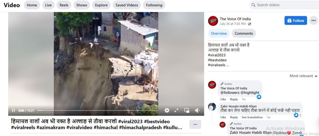 In this context, social media users circulated a video depicting a flooded river eroding its banks, causing mudslides. The Facebook page “Voice of India” accompanied the video with the caption, “People of Himachal Pradesh, there’s still time. Pray to Allah.”
