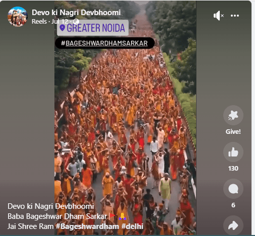 To fact-check the video, Nepal Check broke it into several keyframes. We then analyzed keyframes using Google Lens. We found that the video was widely shared on YouTube. Further search on Google with pertinent keywords led us to a Facebook page named “Devo ki Nagri Devbhoomi,” which shared a similar video with captions placing the event in Greater Noida’s Bageshwar Dham, posted on July 12, 2023. Devotees in the video participate in the procession carrying an urn with chants of “Jai Ram Janaki Baithe Hai Mere Sine Mein,” which translates to “Jai Ram Janaki is sitting in my heart.”