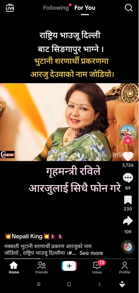 TikTok user @shauravk9 posted photos of Deuba alongside Deputy Prime Minister and Home Minister Rabi Lamichhane, falsely claiming that she was attempting to flee to Singapore from New Delhi due to an alleged arrest order issued by Lamichhane. In a similar post, @raznabin3 claimed that she was arrested in New Delhi. In the first post, the text superimposed on the photo of Deuba along with an audio read: “National Bhauju (wife of elder brother in Nepali) fleeing Delhi for Singapore. Arzu Deuba linked to the Bhutanese refugee scam. Home Minister Rabi (Lamichhane) made a direct call to her.”