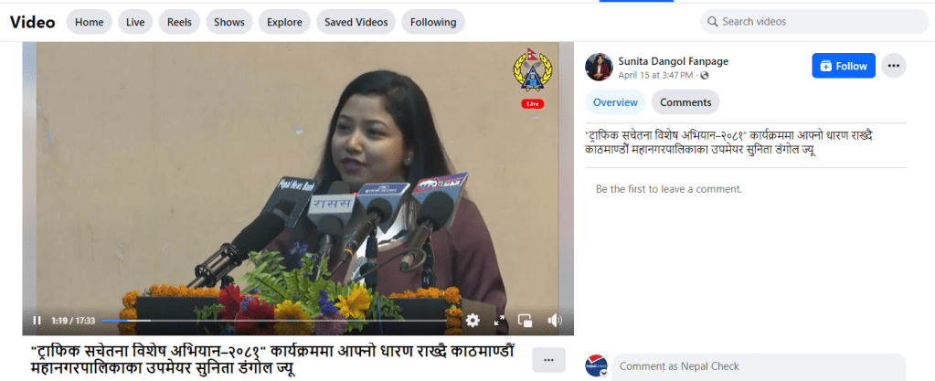 A digital investigation by Nepal Check involved a reverse image search, leading to the discovery of a 17-minute video of Dangol’s speech posted on April 15, 2024, on a Facebook page named Sunita Dangol Fanpage. In her speech, Dangol spoke of her own experience being a volunteer traffic and highlighted the need to increase awareness on road safety. Contrary to the claim, Dangol made no mention of supporting Lamichhane in her address.